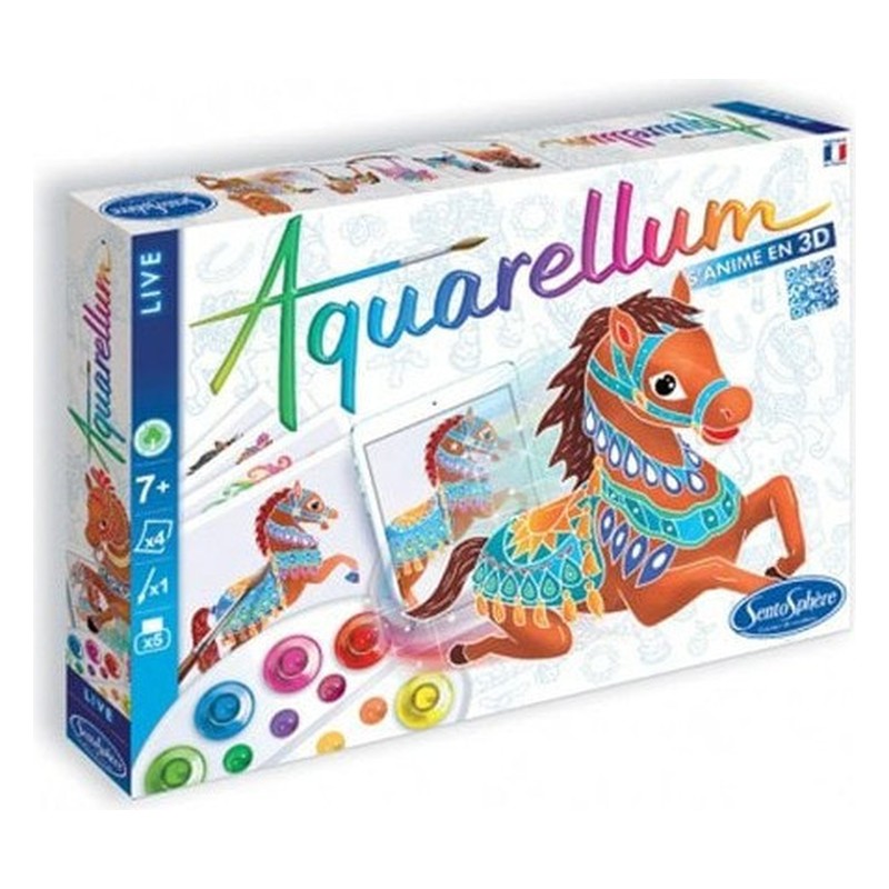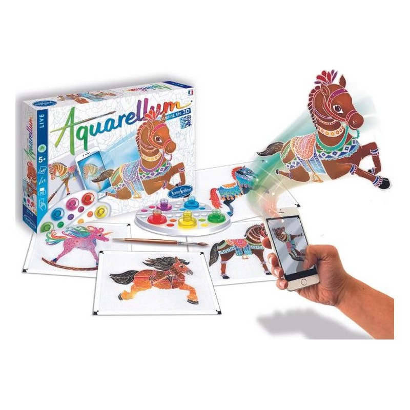 Depuis plus de 20 ans, quelques gouttes de peinture appliquées sur du papier serti séduisent les enfants. Cette technique leur permet de faire de petits chefs-d’oeuvre grâce aux motifs qui apparaissent comme par enchantement, en leur donnant l’impression d’être des artistes accomplis, maîtres de leur palette de couleurs. Cette gamme est idéale pour initier les enfants à l’art, stimuler leur imaginaire, leur concentration et leur habileté. Au galop pour créer avec Aquarellum ! Cette technique picturale conjugue mise en peinture facilitée et couleurs vives ultra faciles à mélanger ! Avec le Coffret de peinture Aquarellum Live – Chevaux la magie va encore plus loin ! Votre enfant donne vie à ses créations en les transformant en 3D ! Après avoir peint son illustration, il la scanne grâce à l’application et le tableau s’anime ! Un selfie avec le tableau s’impose ! Contenu : 4 tableaux sertis 18 x 25 cm, 5 flacons d’encres lavables et non toxiques de 5 ml, 1 pinceau aquarelle, 1 pipette pour doser les encres, 1 palette pour réaliser ses gammes de couleurs, 1 notice sur la perception des couleurs et l’application numérique 3D Live.