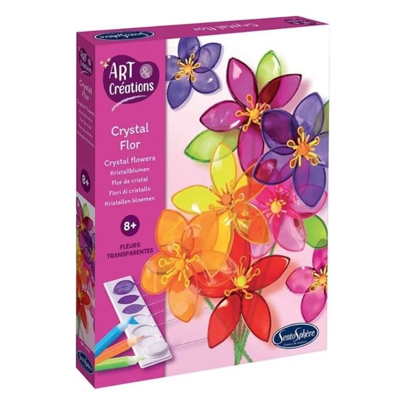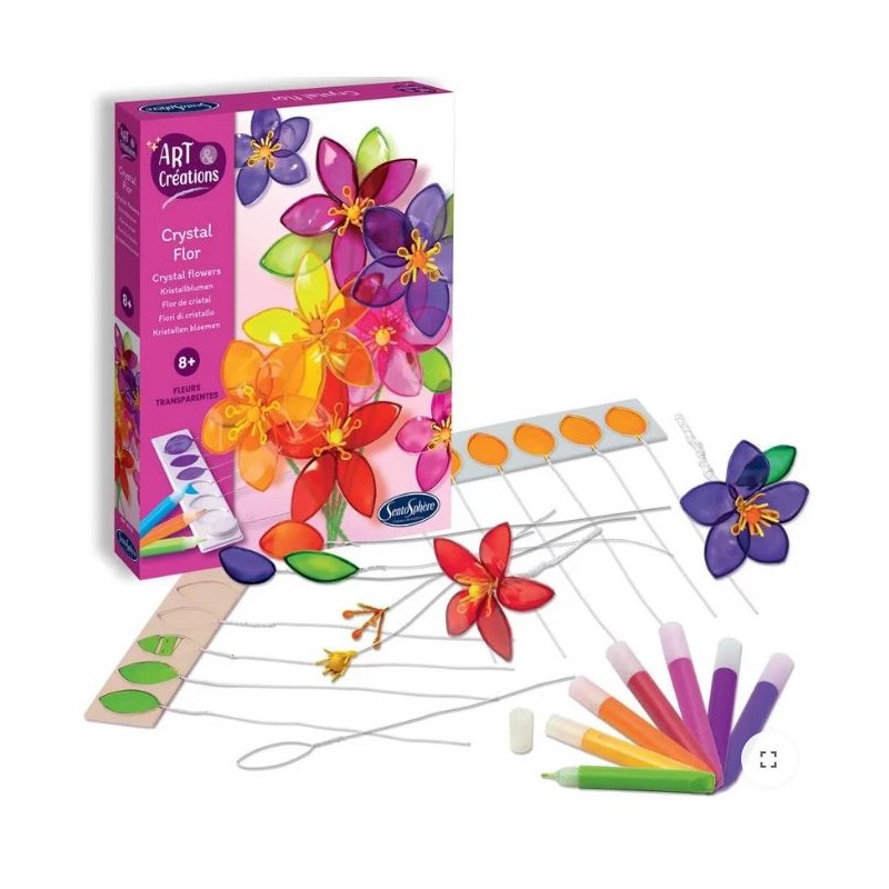 Art & Créations Crystal Flor – Sentosphère Ce coffret permet de créer 8 fleurs qui semblent être en verre effilé, pourtant elles ne sont faites qu’en peinture vitrail. Pour les réaliser, il suffit de former des tiges dans un moule et de les remplir de peinture. En quelques heures, l’eau s’évapore et la couleur devient cristalline. L’assemblage des pétales est un jeu d’enfant qui se complète par des pistils en Patarev. Ainsi, Crystal Flor est un kit complet d’activité manuelle pour ceux qui aiment créer des objets de décoration. Conseils d’utilisation La peinture vitrail est repositionnable ! Vous pouvez en effet réaliser de jolis dessins à apposer sur vos fenêtres, réfrigérateurs et surfaces froides ! Vous pouvez utiliser une pochette plastique pour vous permettre d’utiliser la peinture vitrail qu’il vous reste après avoir réalisé vos fleurs : Glissez le dessin de votre choix à l’intérieur de cette pochette plastique Amusez-vous à tracer les contours avec de la peinture vitrail Laissez un peu sécher puis comblez le reste du motif, toujours avec la peinture vitrail Après quelques heures, vos créations seront sèches et translucides ! Vous pouvez maintenant les apposer sur vos fenêtres ou votre réfrigérateur ! Pas de panique, vous pourrez facilement décoller vos créations pour les repositionner à votre guise. Contenu : 10 tubes de peinture vitrail 2 moules de formage 1 sachet de Patarev 2 petits rouleaux de papier vert 1 notice