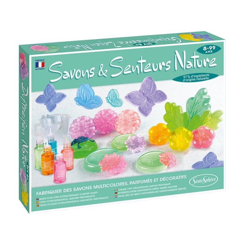 Un coffret DIY aux formules vegan pour faire de beaux savons multicolores sur le thème de la nature : nénuphar, lotus, papillons ou grenouilles. Tous les accessoires sont pensés pour faciliter la création. Très facile d’utilisation, la base glycérine fond au bain marie ou au micro-ondes, se parfume et se colore suivant une palette de couleurs acidulées. Des recharges permettent d’utiliser longtemps ce coffret pour le bonheur de la planète, comme de celui des enfants. Idéal à utiliser pour soi, ou à offrir. Ce coffret est 100% fabriqué en France, il a été testé selon les normes cumulées du Jouet et de la Cosmétique. Il contient des ingrédients et des formules qui ne présentent aucun danger. Testé sous contrôle médical, les peaux les plus fragiles peuvent utiliser ce type de savon que l’on appelle SYNDET. Contenu : une base glycérine à 98% d’origine naturelle, 1 moule avec 10 formes, 1 bécher, 3 colorants cosmétiques et 2 parfums dans des flacons pipettes pour doser les bonnes quantités.
