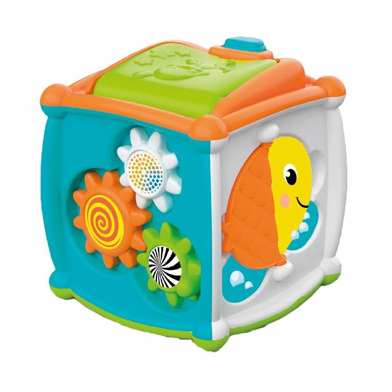 Ce cube stimule la motricité fine et éveille la curiosité de l’enfant. Grâce à ses 5 zones de jeu aux fonctions variées, il l’aide à se concentrer sur une activité, améliorant ainsi sa capacité d’attention. Une simple pression sur le bouton ouvre le couvercle et un petit chien en peluche en sort. En tournant la fleur, l’abeille se met à voler autour. Le lapin saute pour attraper la carotte et le petit poisson tourne la page Dimensions : 25.5 x 21 x 6.5 cm