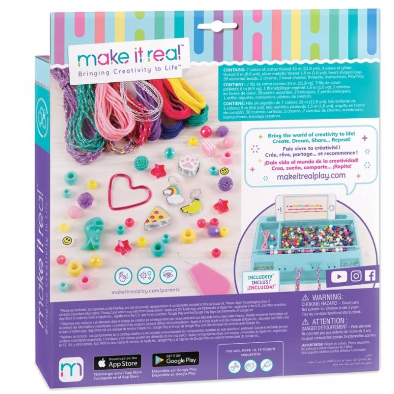 Apprenez à créer des bracelets et à ajouter des breloques à des bracelets en spirale qui peuvent également être utilisés comme élastiques à cheveux. Contenu: 7 couleurs de fil de coton 20 m (21,9 yrd) – 3 couleurs de fil pailleté 6 m (6,6 yrd) – fil métallique argenté 1,5 m (1,6 verge) – boucle en forme de coeur – 38 perles assorties – 2 charmes – 2 breloques perles – enfileur – instructions – PlayTray