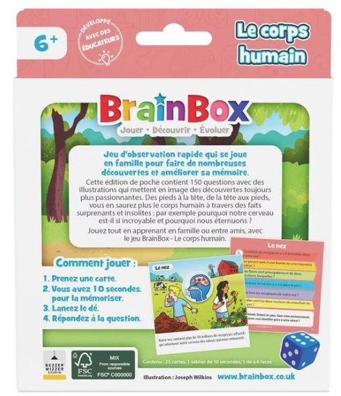 BrainBox Pocket : Le Corps Humain est un jeu éducatif et interactif idéal pour les passionnés de sciences naturelles. Ce jeu amusant stimule les compétences d’observation et de mémoire des enfants à partir de 8 ans. En jouant, les enfants découvriront des faits fascinants sur le corps humain, comme ce qui rend notre cerveau si extraordinaire !