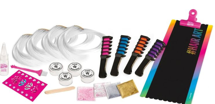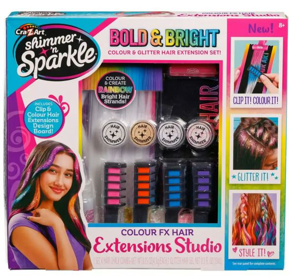 Le Color FX Hair Extension Studio est un jouet créatif idéal pour les jeunes stylistes en herbe. Conçu pour les enfants à partir de 8 ans, ce kit permet d’ajouter de superbes effets arc-en-ciel à n’importe quelle coiffure. Les enfants peuvent colorer et pailleter leurs extensions de cheveux de style salon pour une touche unique et personnalisée ! Il suffit de clipser les extensions sur le tableau Colorist Design Hair Art et de peigner pour révéler les magnifiques couleurs.