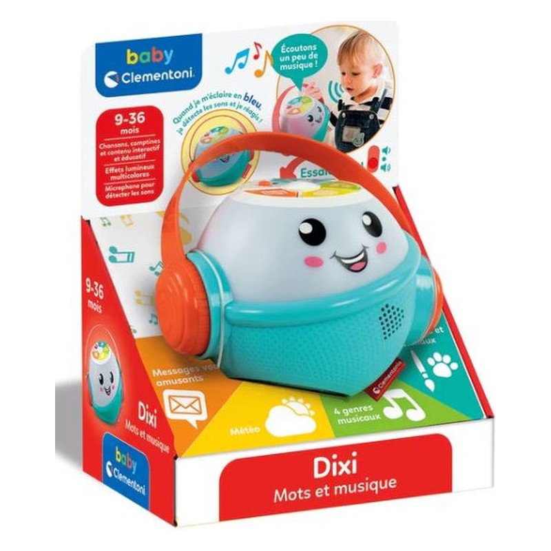 Dixi est un amusant compagnon de jeu interactif riche en contenus ! Les 4 boutons permettent de découvrir la météo, les couleurs, les animaux et leur cri et stimulent le développement du langage avec de jolies comptines. Rythme et plaisir garantis avec de nombreuses chansons et différents genres musicaux à découvrir ! Dixi réagit à la voix de l’enfant grâce au microphone ; les effets lumineux multicolores rendent le jeu encore plus amusant et attirent l’attention des petits. La poignée pratique, en forme de casque, permet d’emporter Dixi partout avec soi. Dimensions : 20 x 25 x 13 cm