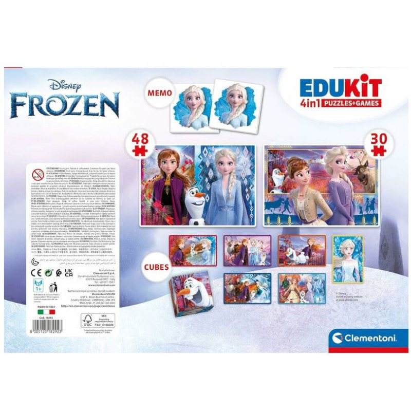 oue et amuse-toi avec Elsa, Anna et tous leurs amis ! Mettez la main sur ce nouveau et complet Edukit 4 en 1 Frozen by Clementoni ! Amusez-vous à créer de magnifiques images d’Elsa et d’Anna, pièce par pièce, et jouez au jeu amusant Memo, un jeu de mémoire qui met à l’épreuve toute la famille. En outre, un puzzle cubique spécial est inclus, avec 6 images différentes à créer. Comprend : 1 boîte avec 1 puzzle de 30 pièces de Frozen, 1 puzzle de 48 pièces de Frozen, 1 jeu de mémos de 48 cartes avec des images de Frozen et 1 puzzle de 6 cubes avec des images de Frozen. Dimensions : 37 x 26 x 4.6 cm