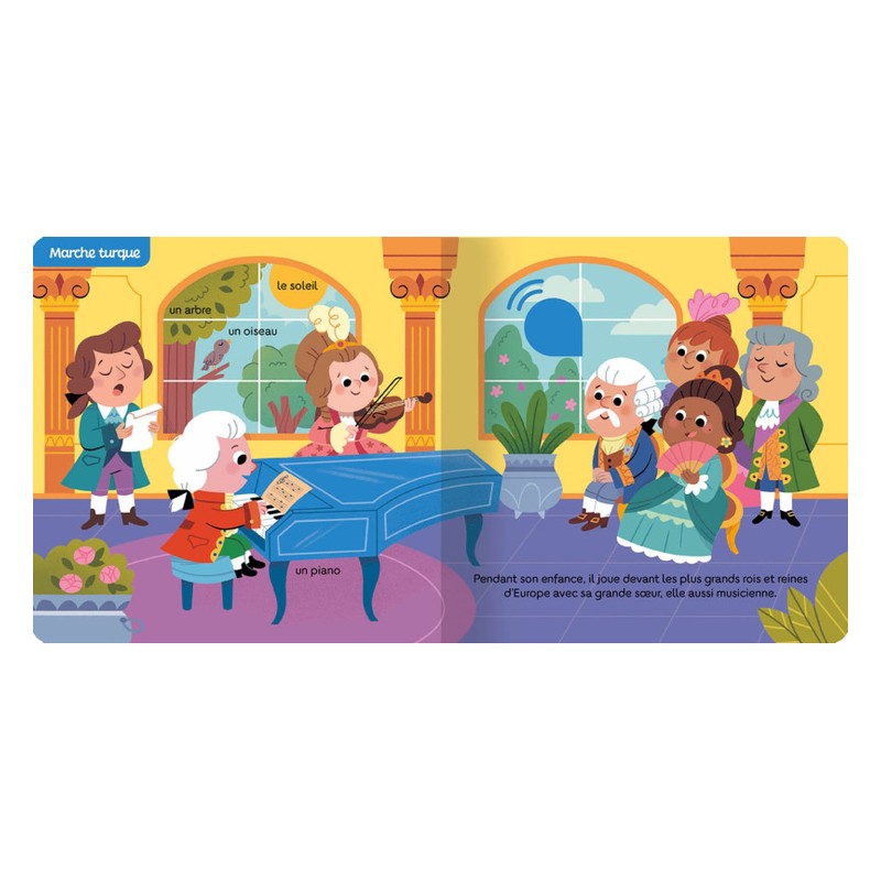 6 extraits sonores :- Une petite musique de nuit- Marche Turque- Les noces de Figaro- La reine de la nuit- Requiem- Symphonie n°40L’ouvrage contient un bouton on/off (pour durer plus longtemps) et des piles AAA (faciles à changer) !