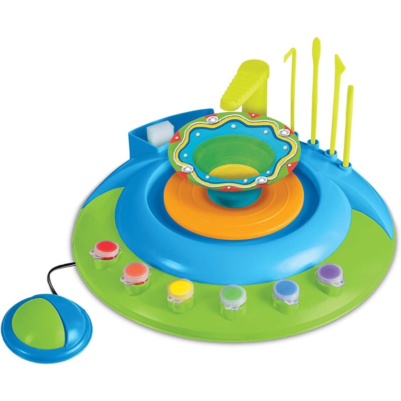Crée de la vraie poterie Comprend un ensemble d’outils de sculpture et des peintures pour sculpter et décorer votre création Idéal pour les débutants Fonctionne sur piles avec pédale marche/arrêt laissant les deux mains libres pour créer Allumez-le et laissez la créativité tourner !