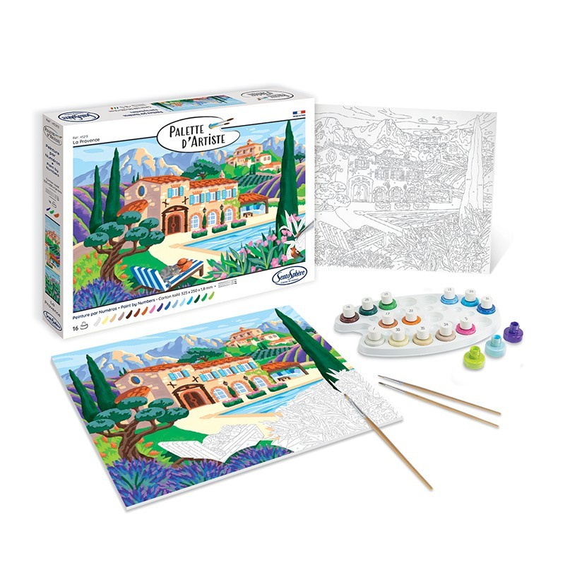 Laissez-vous porter par l’éclat des couleurs avec la peinture par numéros Palette d’Artiste – Provence. Faites apparaître, couleur après couleur, une belle maison entourée de verdure et de montagnes, une piscine aux eaux éclatantes et des transats parfaits pour se détendre sous le soleil. Conçu pour les adolescents et adultes, ce coffret vous offre une expérience de peinture par numéros unique. Avec 21 magnifiques références, chaque tableau devient une invitation au voyage, à l’évasion et à la relaxation. Notre gamme a été conçue pour garantir un travail agréable grâce à une toile fine et facile à manipuler, qui permet de peindre sans que la peinture n’accroche, facilitant ainsi la réalisation de contours précis. Chaque coffret contient deux ou trois pinceaux adaptés au format du tableau, ainsi qu’une palette de 13 à 17 couleurs acryliques soigneusement sélectionnées. Vous apprécierez leur texture fluide et leur fini satiné pour un rendu impeccable et parfaitement couvrant. La peinture est formulée à base d’acrylique, associée à 50 % de composants bio-sourcés d’origine végétale et européenne. Ce mélange permet de préserver la texture satinée de la peinture, offrant un résultat lumineux tout en garantissant une application fluide et sans effet collant. La palette incluse vous permet de créer vos propres nuances de couleurs pour une touche encore plus personnelle et de laisser libre cours à votre imagination. De plus, la notice fournie reprend le schéma du dessin avec les lignes et numéros plus marqués pour aider à la mise en couleurs. Contenu : 1 tableau en carte toilée contrecollée (25 x 32,5 x 1,8 cm) Au minimum 13 couleurs de peintures acryliques non toxiques Pinceaux de très grande qualité 1 palette pour mélanger les peintures 1 notice multilingue sur la perception des couleurs Dimensions : 33,5×22,5×3 cm