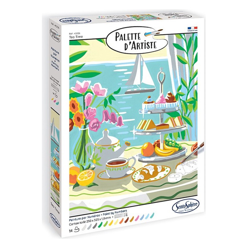 Prenez une pause et installez-vous pour un moment gourmand. Avec la peinture par numéros Palette d’Artiste – Tea Time, amusez-vous à colorer une jolie scène de salon de thé au bord de l’eau. Entre gâteaux, friandises, fleurs et voiliers, profitez de couleurs pastel et faciles à appliquer. Conçu pour les adolescents et adultes, ce coffret vous offre une expérience de peinture par numéros unique. Avec 21 magnifiques références, chaque tableau devient une invitation au voyage, à l’évasion et à la relaxation. Notre gamme a été conçue pour garantir un travail agréable grâce à une toile fine et facile à manipuler, qui permet de peindre sans que la peinture n’accroche, facilitant ainsi la réalisation de contours précis. Chaque coffret contient deux ou trois pinceaux adaptés au format du tableau, ainsi qu’une palette de 13 à 17 couleurs acryliques soigneusement sélectionnées. Vous apprécierez leur texture fluide et leur fini satiné pour un rendu impeccable et parfaitement couvrant. La peinture est formulée à base d’acrylique, associée à 50 % de composants bio-sourcés d’origine végétale et européenne. Ce mélange permet de préserver la texture satinée de la peinture, offrant un résultat lumineux tout en garantissant une application fluide et sans effet collant. La palette incluse vous permet de créer vos propres nuances de couleurs pour une touche encore plus personnelle et de laisser libre cours à votre imagination. De plus, la notice fournie reprend le schéma du dessin avec les lignes et numéros plus marqués pour aider à la mise en couleurs. Contenu : 1 tableau en carte toilée contrecollée (25 x 32,5 x 1,8 cm) Au minimum 13 couleurs de peintures acryliques non toxiques Pinceaux de très grande qualité 1 palette pour mélanger les peintures 1 notice multilingue sur la perception des couleurs Dimensions : 33,5 x 22,5 x 3 cm