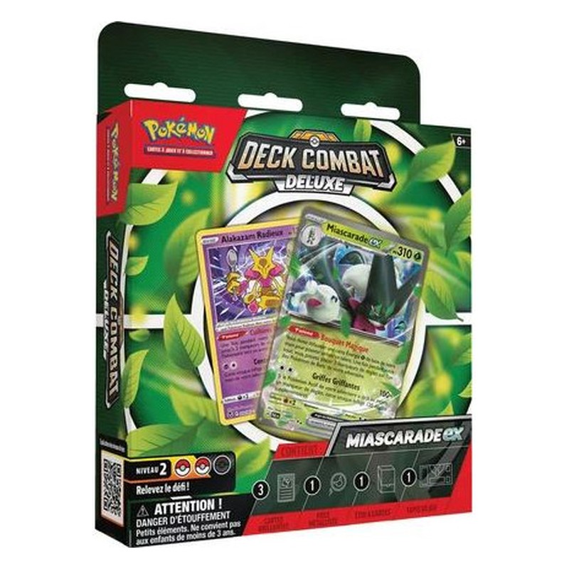 Le nouveau Deck Combat Deluxe du JCC Pokémon offre un défi de taille aux joueurs et aux joueuses qui souhaitent passer à la vitesse supérieure. Retrouvez des stratégies avancées et des cartes puissantes supplémentaires. Choisissez parmi Miascarade-ex 310 PV et Palmaval-ex 320 PV. Contenu : 1 deck prêt à l’emploi de 60 cartes dont 3 cartes brillantes 1 tapis de jeu pour 1 joueur – 1 lot de marqueurs de dégâts – 1 grande pièce métallisée – 2 marqueurs d’États Spéciaux – 1 étui à cartes – 1 page de stratégies – 1 carte à code pour jouer en ligne avec ce deck –
