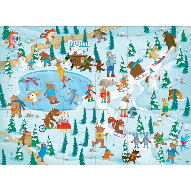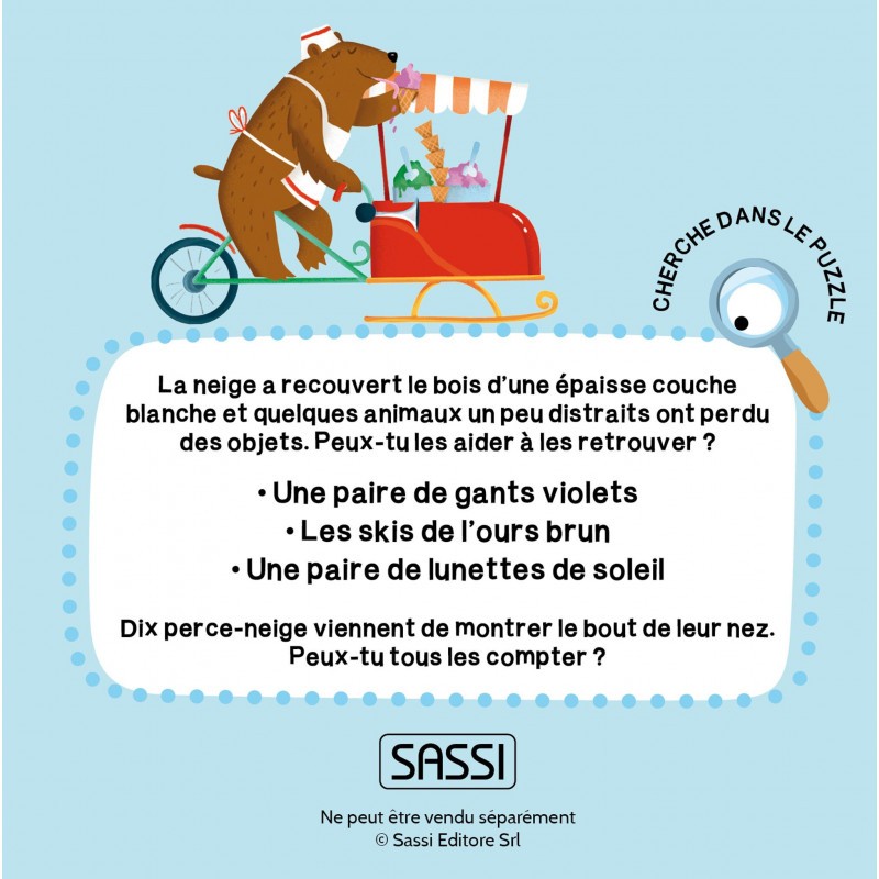 L’hiver est arrivé et les animaux du bois ont un tas d’idées pour s’amuser dans la neige ! Fais le puzzle, lis le petit livre et découvre la magie de l’hiver ! De délicates illustrations pour introduire le thème de la neige auprès des enfants. Un livre en carton avec une histoire en rime et des objets à trouver. Un puzzle grand format adapté aux mains des plus petits. Contenu 1 Puzzle géant de 30 pièces – dimension 62 x 45 cm et 1 livre de 10 pages