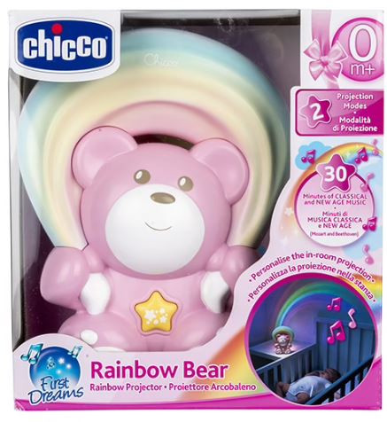 La veilleuse musicale Rainbow Bear Pink apaisera votre bébé avec sa douce lumière arc-en-ciel et ses mélodies relaxantes. Un compagnon idéal pour des nuits sereines.
