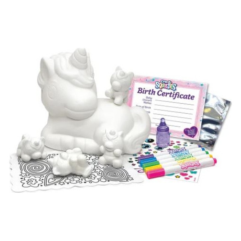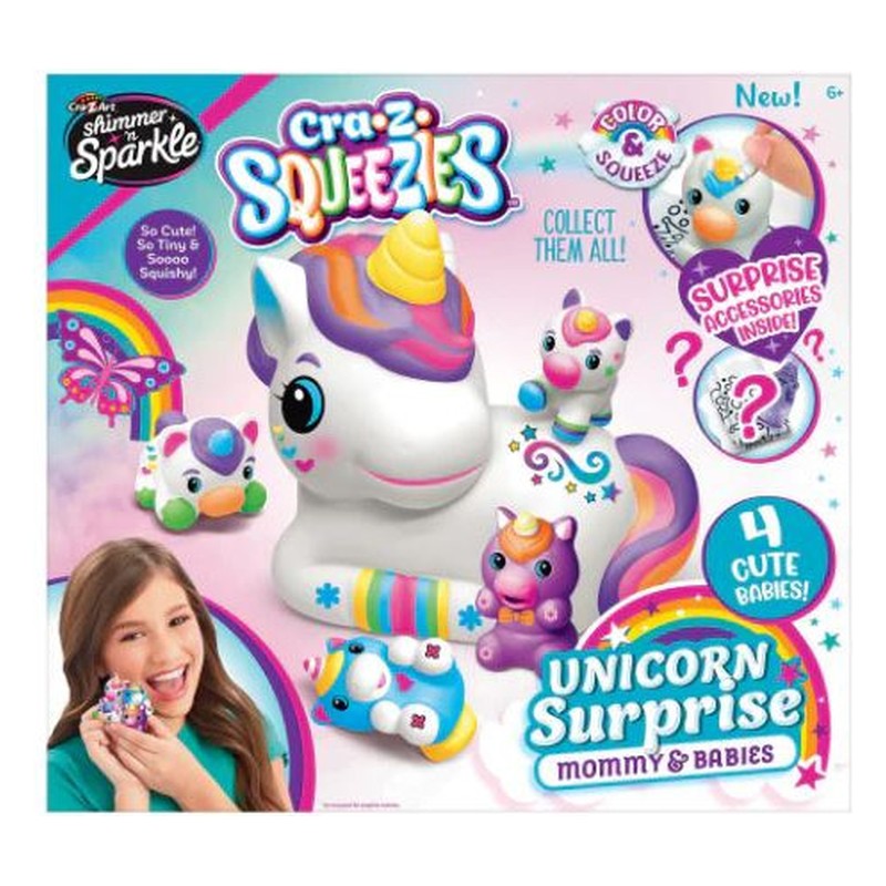Les Cra-Z-Squeezies licorne surprise pour maman et bébé Shimmer ‘n Sparkle sont une activité de loisirs créatifs très amusante. Les Cra-Z-Squeezies Shimmer ‘n Sparkle sont super doux et agréables à presser. Coloriez votre propre maman licorne avec 4 bébés, en les rendant aussi colorés que vous le souhaitez ! Ces jouets à presser se gonflent lentement, ce qui les rend parfaits pour les presser encore et encore ! Contenu : sont inclus 5 comprimés parfumés, 5 créateurs vibrants, 1 biberon, 1 mini couverture, 1 certificat de naissance, 1 feuille d’autocollants.