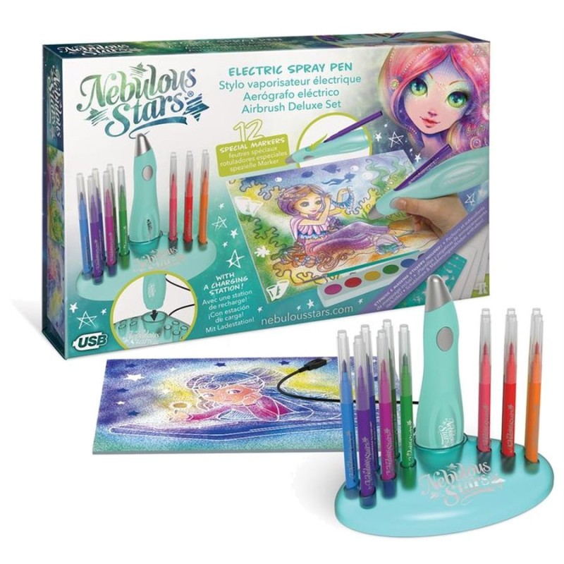 Peins à l’aérographe comme les pros! Sélectionne la peinture à l’eau de ton choix, insère le feutre dans le stylo électrique rechargeable, puis pulvérise doucement la peinture sur les tableaux. Comprend aussi des pochoirs et de la peinture aquarelle. Contenu : Comprend également des pochoirs, des peintures à l’aquarelle et un marqueur de gomme de masquage. Dimensions : 45,5 x 29 x 7 cm