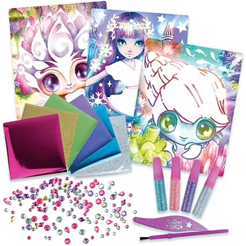 Crée des chefs-d’œuvre étincelants avec une méthode simple et efficace. Retire les pièces pré-coupées pour décorer chaque partie avec un papier métallisé, de la poudre scintillante et des strass. Contenu : 3 tableaux imprimés prêts à être décorés 6 feuilles de papier métallisé 4 tubes de poudre scintillante Strass Outil de transfert et pinceau L’histoire…