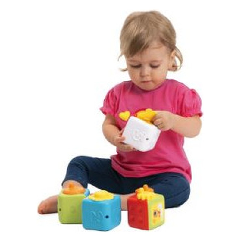 Quatre cubes colorés remplis d’activités pour stimuler les capacités manuelles et logiques de votre enfant. Jouabilité évolutive pour accompagner l’enfant à travers les différentes étapes de croissance. Quatre cubes colorés, pleins d’activités pour stimuler les capacités manuelles et logiques de votre enfant. Avec des modes de jeu évolutifs pour accompagner l’enfant à travers les différentes étapes de sa croissance. De 10 à 18 mois : votre enfant empile les cubes de façon aléatoire et découvre les activités manuelles sur les cubes. De 18 à 36 mois : votre enfant peut associer les images par paire : poussin-poulet, chaton-chat, soleil-arc-en-ciel et champignon-fleur. 4 activités manuelles différentes : appuyer sur la fleur pour entendre un effet sonore amusant, faire pivoter la petite fenêtre, tourner les engrenages et faire tourner la roue Empile les cubes en respectant l’ordre numérique ! Développé en collaboration avec l’Association nationale des pédagogues italiens et inspiré par la méthode Montessori.