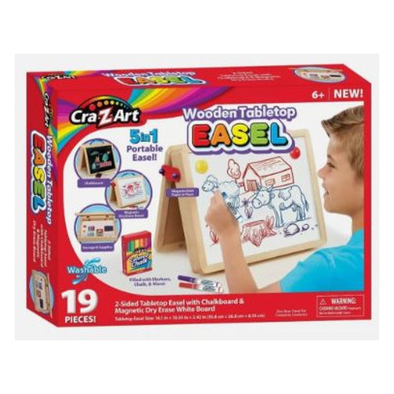 Chevalet de table portable en bois 5 en 1 Cra-Z-art avec tableau noir et effaçable à sec * Comprend plusieurs fournitures artistiques pour créer sur du papier, un tableau Rangez les fournitures d’art à l’intérieur du chevalet Inclut une poignée pour un transport facile ! Poids du colis : 1,572 kilogrammes