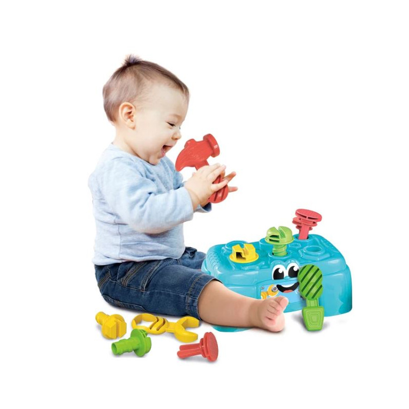 Un atelier de bricolage avec 3 outils (1 marteau, 1 tournevis et 1 pince) et 6 accessoires (clous, boulons et vis) pour s’amuser à bricoler. Il se transforme en caisse à outils que l’enfant peut emporter partout. Il stimule la coordination main-œil et la motricité fine. Dimensions : 24 x 15 x 15 cm