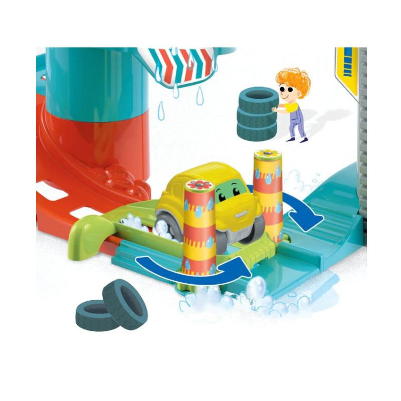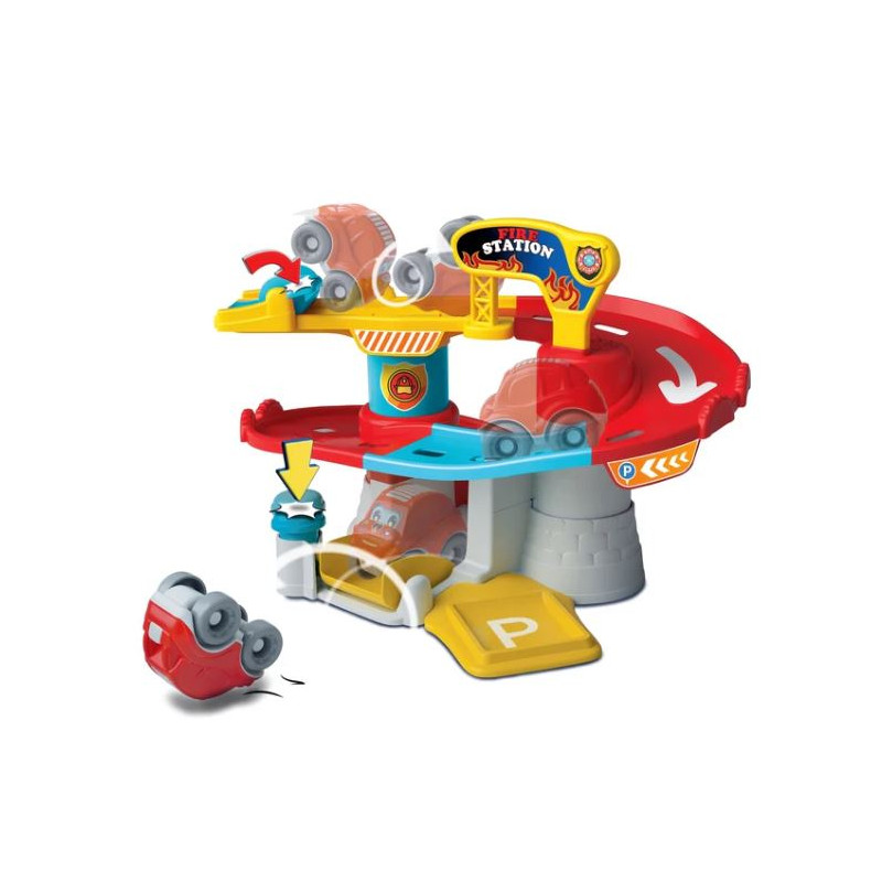Une caserne de pompiers avec une piste pour que les véhicules de secours puissent filer et passer à travers les deux zones de “culbutes” ! La voiture dévale la piste et, grâce à un levier, fait des culbutes amusantes sur son parcours. Les activités mécaniques sont conçues pour développer la dextérité et la perception tactile…