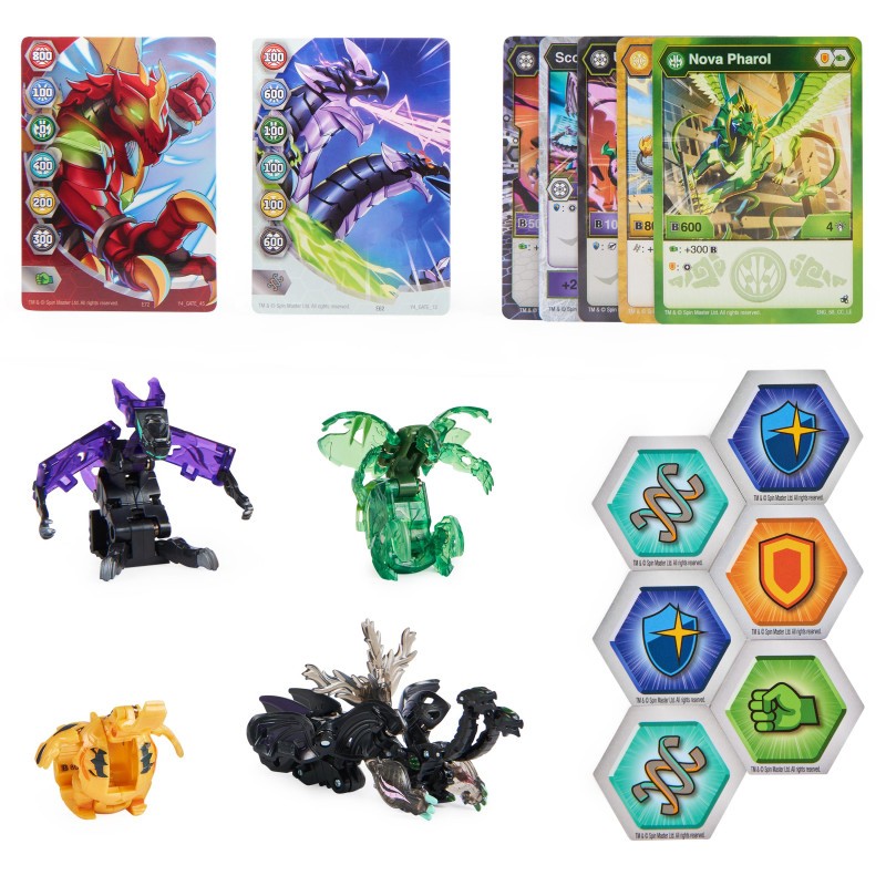 L’ensemble collector Bakugan Legends comprend tout ce dont vous avez besoin pour partir au combat dès la sortie de la boîte ! L’ensemble comprend 4 figurines Bakugan, des personnages à collectionner, des cartes de capacité, des cartes d’ouverture et bien plus encore ! Votre collection de jouets Bakugan est devenue plus forte que jamais avec les figurines Nova Bakugan qui s’illuminent ! Regardez un véritable spectacle de lumière lorsque vous les lancez sur le BakuCore (6 dans un set) ! Regardez votre Bakugan s’ouvrir et se transformer en une créature féroce. Jouez votre Geogan pendant le combat et effectuez une attaque surprise pour vaincre votre adversaire ! Une variété de Master Geogans vous permettra d’infliger des dégâts auparavant inaccessibles au combat. Utilisez les cartes de capacité incluses pour encore plus de façons de jouer et de gagner des bonus dans l’arène de combat de Bakugan ! Ajoutez des jouets Bakugan Legends Saison 5 pour filles et garçons, y compris le Geogan et le Nova Bakugan qui s’illuminent (chacun vendu séparément), à votre collection et construisez votre propre équipe de rêve ! Utilisez la boîte Baku-tin (vendue séparément) comme espace de rangement parfait pour tous vos intrépides Bakugan Battle Brawlers et vos cartes. Collectionnez vos personnages préférés de la série culte (sur Netflix) et participez à une bataille de Bakugan avec vos collections préférées de figurines et de cartes Bakugan ! Faites passer vos combats au niveau supérieur avec la toute nouvelle collection Bakugan Legends !