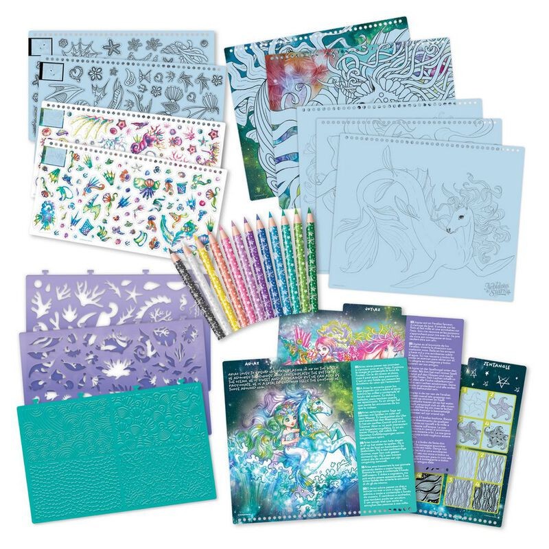Crée de superbes chevaux magiques qui auront fière allure aux côtés des Stars. Utilise une variété de techniques de dessin, de pochoirs et d’autocollants pour dessiner le cheval de tes rêves. Contenu : 35 pages à dessiner mauves 80 pochoirs Plus de 80 motifs inspirants pour pochoir 4 motifs à frotter 2 pages d’autocollants 2 pages d’autocollants à colorier 12 crayons de couleur 12 techniques de dessin 3 sections différentes Théorie des couleurs et instructions Dimensions : 31,5 x 30 x 2,3 cm