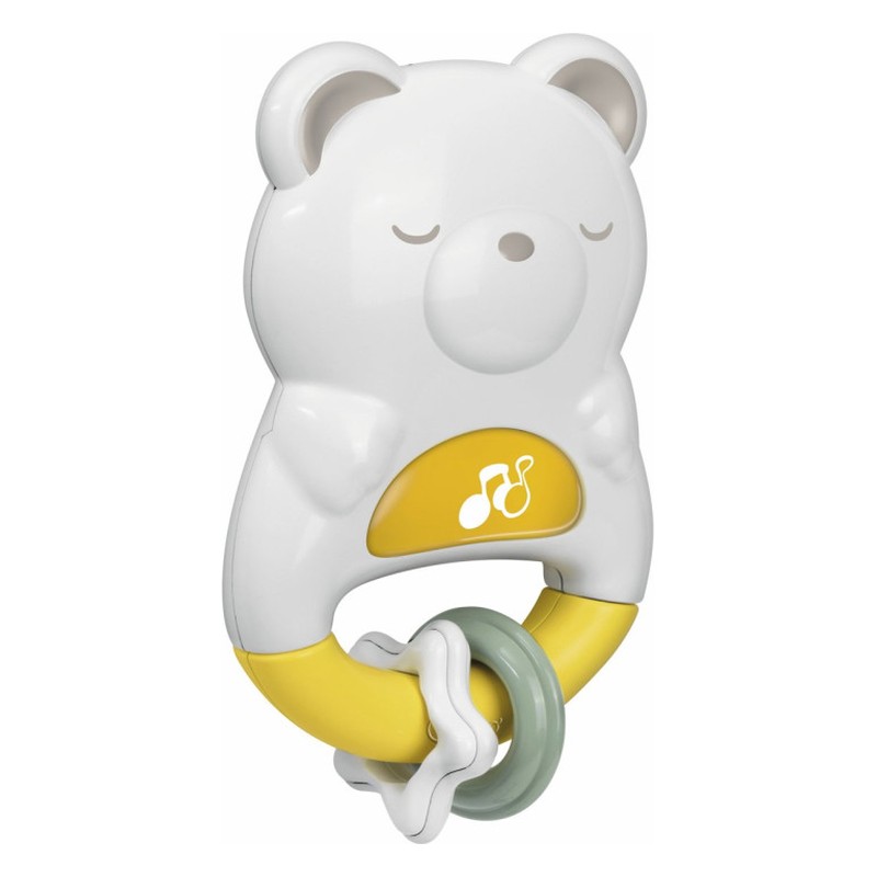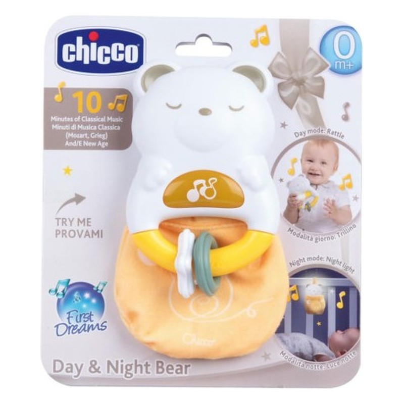 Leur premier hochet électronique innovant 2 en 1 avec deux modes : il divertit bébé pendant la journée et se transforme en veilleuse à l’heure du coucher. Mode jour : en appuyant sur le bouton central on active des mélodies joyeuses et des lumières clignotantes. Mode nuit : une fois inséré dans le sac de couchage, en appuyant sur le bouton central, le hochet commence à jouer des mélodies relaxantes avec des lumières douces. Il comprend 10 minutes de musique classique (Mozart, Grieg) et New Age. Compatible avec la plupart des lits en bois grâce aux accroches pratiques des sacs de couchage