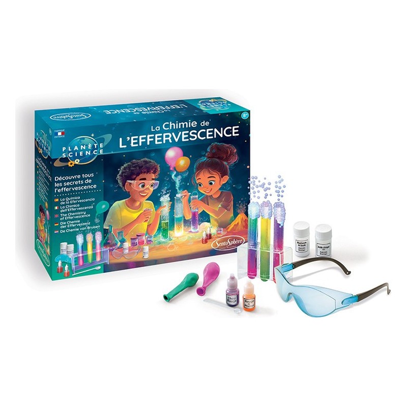 La Chimie de l’Effervescence vous propose de découvrir l’univers mystérieux de la chimie grâce à des expériences aussi spectaculaires qu’amusantes : créer une réaction d’effervescence dans un tube à essai et dans un petit volcan, mesurer le pH de l’eau ou encore observer des changements de couleur dans une substance liquide… en toute sécurité bien sûr ! Un jeu éducatif qui permettra à votre enfant de faire de la science tout en s’amusant ! Contenu 1 support de tubes à essai 3 tubes à essai 1 mini cuillère doseuse 2 ballons 1 pipette 1 soucoupe 2 réactifs colorés 1 pot d’acide citrique 1 pot de bicarbonate de soude 1 paire de lunettes de sécurité 1 mode d’emploi Dimensions : 20,5x25x6,3 cm