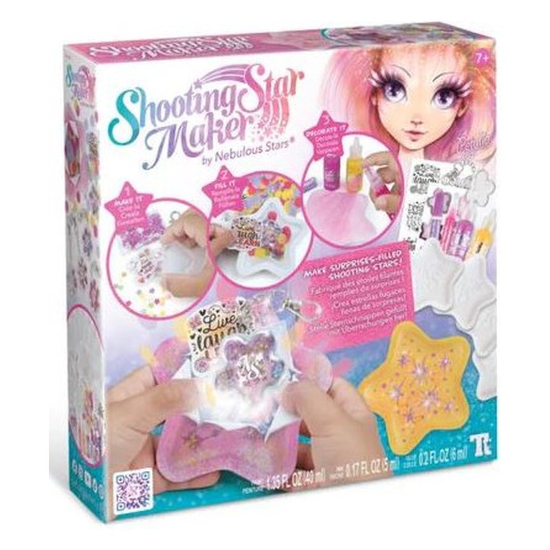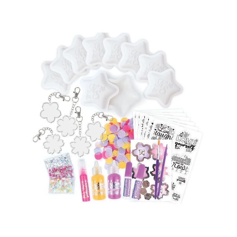 Fabrique des étoiles filantes dans lesquelles tu auras placé un mot inspirant dans une bouteille et un petit cadeau. Offre-les ensuite à tes proches pour ainsi leur transmettre des ondes positives et un peu de bonheur ! Contenu : 10 étoiles en pâte à papier 5 bouteilles miniatures 2 bouteilles de peinture Vaporisateur d’encre 6 pages de messages inspirants Télécharge et imprime la version française Paillettes et poudre scintillante Confettis en papier Tube de colle 40 perles et 5 cordes Page d’autocollants Pinceau Bâtonnet en plastique Instructions en couleurs