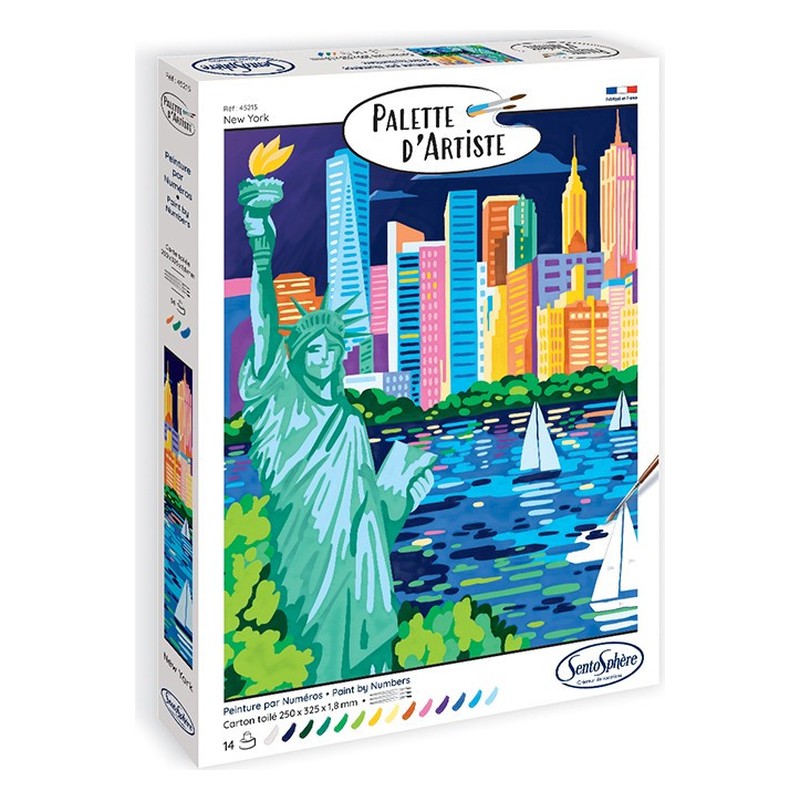 Partez à la découverte de la ville qui ne dort jamais avec la peinture par numéros Palette d’Artiste – New York. Donnez vie à ses symboles emblématiques, comme les grands buildings et la Statue de la Liberté, avec des couleurs pétillantes qui reflètent l’énergie unique de cette ville qui fait rêver. Conçu pour les adolescents et adultes, ce coffret vous offre une expérience de peinture par numéros unique. Avec 21 magnifiques références, chaque tableau devient une invitation au voyage, à l’évasion et à la relaxation. Notre gamme a été conçue pour garantir un travail agréable grâce à une toile fine et facile à manipuler, qui permet de peindre sans que la peinture n’accroche, facilitant ainsi la réalisation de contours précis. Chaque coffret contient deux ou trois pinceaux adaptés au format du tableau, ainsi qu’une palette de 13 à 17 couleurs acryliques soigneusement sélectionnées. Vous apprécierez leur texture fluide et leur fini satiné pour un rendu impeccable et parfaitement couvrant. La peinture est formulée à base d’acrylique, associée à 50 % de composants bio-sourcés d’origine végétale et européenne. Ce mélange permet de préserver la texture satinée de la peinture, offrant un résultat lumineux tout en garantissant une application fluide et sans effet collant. La palette incluse vous permet de créer vos propres nuances de couleurs pour une touche encore plus personnelle et de laisser libre cours à votre imagination. De plus, la notice fournie reprend le schéma du dessin avec les lignes et numéros plus marqués pour aider à la mise en couleurs. Contenu : 1 tableau en carte toilée contrecollée (25 x 32,5 x 1,8 cm) Au minimum 13 couleurs de peintures acryliques non toxiques Pinceaux de très grande qualité 1 palette pour mélanger les peintures 1 notice multilingue sur la perception des couleurs Dimensions : 33,5×22,5×3 cm
