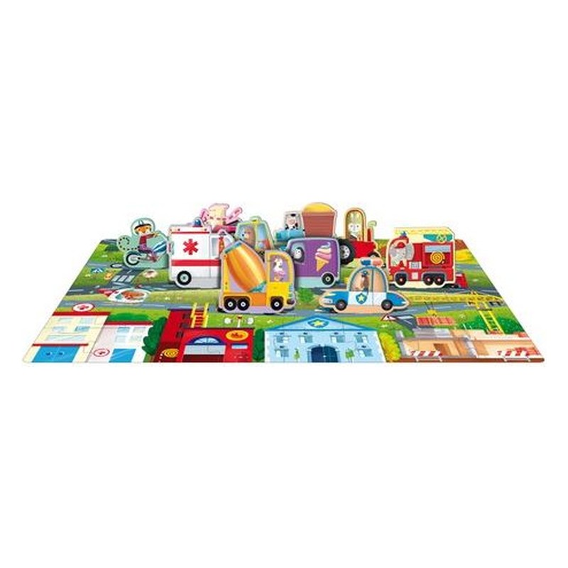 Les rues de nos villes sont parcourues chaque jour par de nombreux véhicules : ambulances, voitures de police, camions, tracteurs… découvre-les tous et apprends, grâce à eux, à reconnaître les formes. Contenu : Une boîte aux détails brillants contenant un livre de 10 pages, un puzzle de 40 pièces et 10 véhicules à emboîter, pour apprendre à reconnaître et associer les formes.