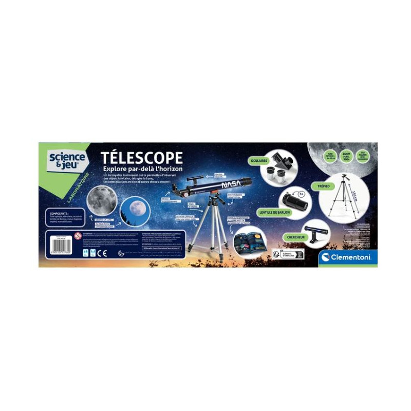 Un véritable télescope de la NASA pour observer la lune et les étoiles ! Avec un objectif de 50 mm et des objectifs interchangeables pour différents effets d’agrandissements. Le télescope est doté d’un trépied pouvant être réglé jusqu’à 130 cm de hauteur, idéal pour une observation stable et confortable. Le manuel illustré accompagne l’enfant à la découverte des principes de l’astronomie de façon simple et amusante. Dimensions : 61.1 x 22.5 x 9.6 cm