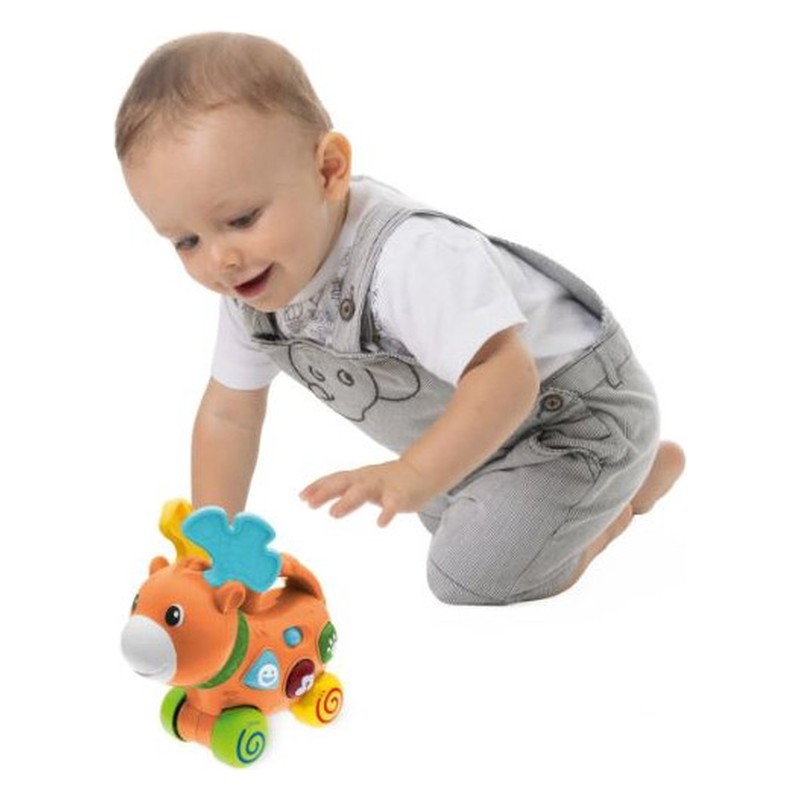 L’élan électronique pour s’amuser avec des mélodies et des sons. Élan avec roues libres et poignée facile à saisir : appuie sur les boutons pour entendre des sons et des mélodies joyeuses. Tourne le collier clic-clac ! Bois de cerf avec surface texturée pour une stimulation tactile